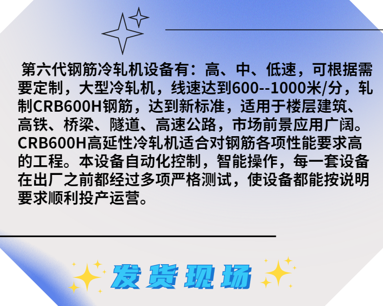 | 公司主要產(chǎn)品:冷軋機(jī)、冷軋?jiān)O(shè)備、收線機(jī)、兩肋冷軋機(jī)、鋼筋調(diào)直切斷機(jī)、鋼筋調(diào)直機(jī)、鋼筋切斷機(jī) |